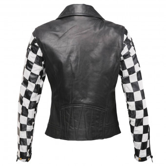 Avec ses manches damier, symbole incontournable des courses racing, le blouson moto en cuir pour femme "Beth" se joue des codes de la piste dans un style 100% rock, marque de fabrique d'Eudoxie.